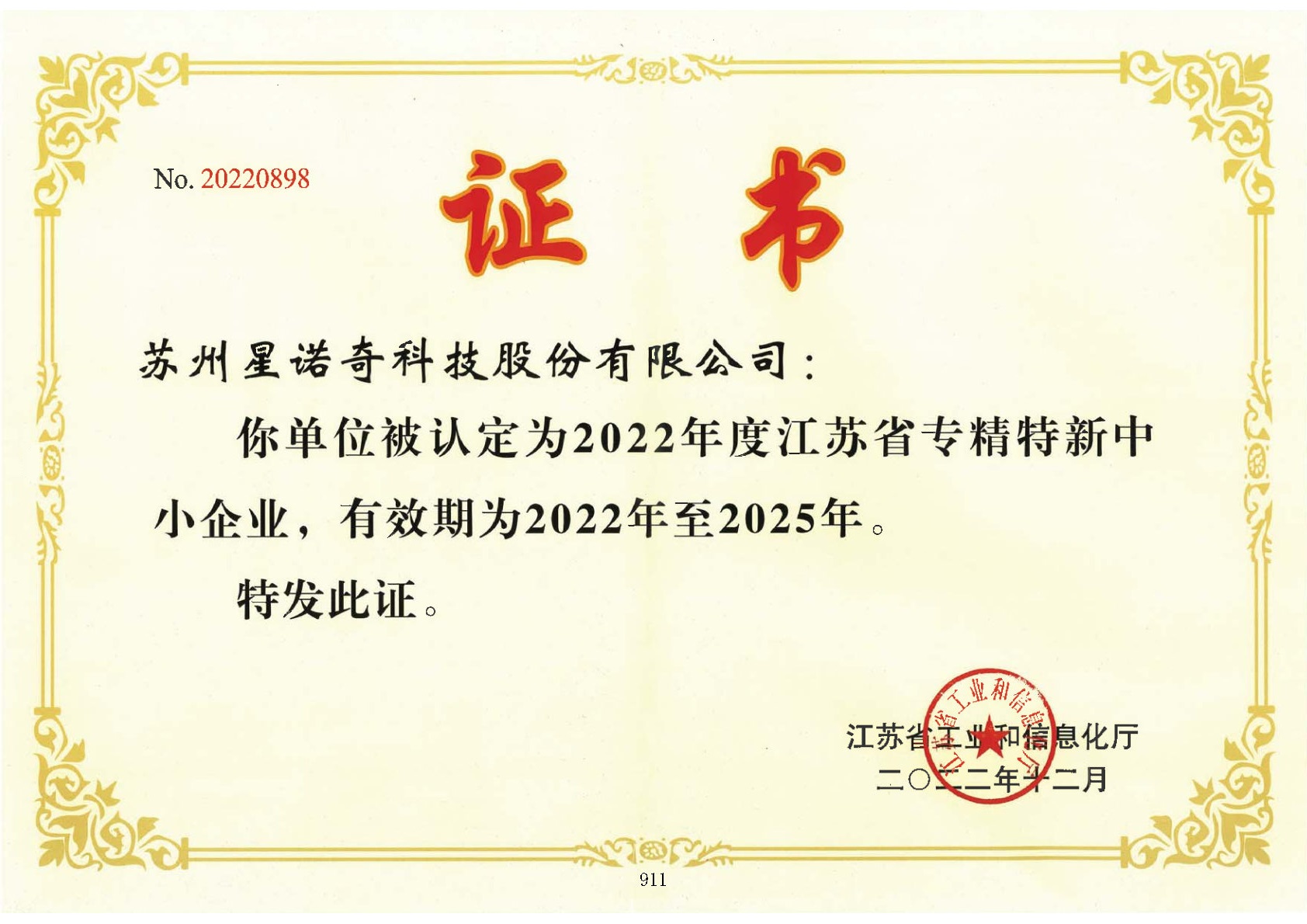 近日,苏州星诺奇科技股份有限公司成功获评2022年度江苏省专精特新中小企业。