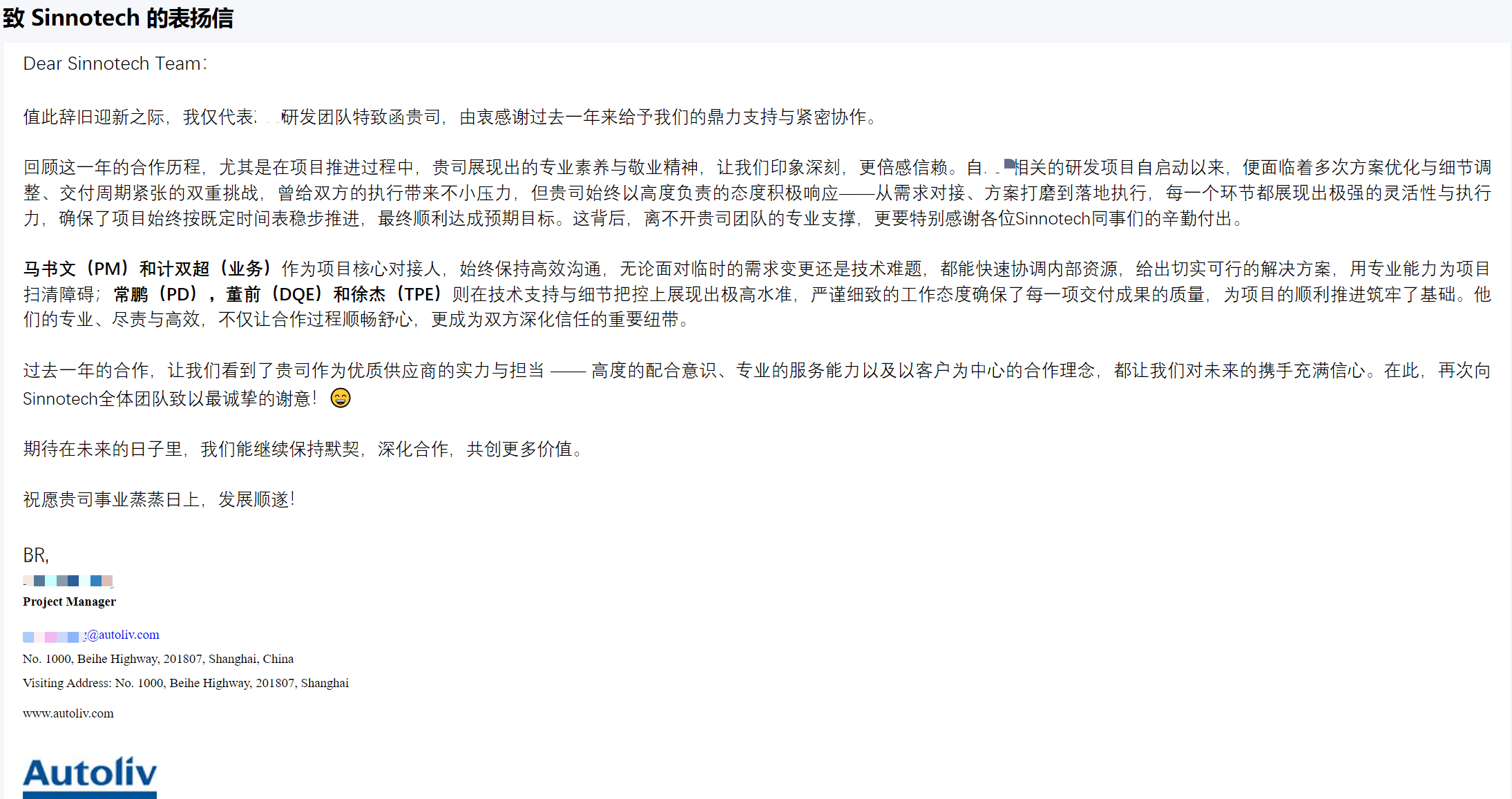 奥托立夫在信中特别赞扬了我司团队的专业素养与敬业精神,并点名表扬了多位核心对接人: