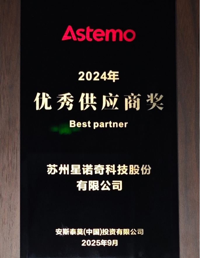 近日,苏州星诺奇科技股份有限公司凭借在精密注塑零部件领域的卓越制造能力、稳定的产品质量及高效的交付服务,成功通过全球知名汽车零部件供应商安斯泰莫(Astemo)的评审,荣获其颁发的“2024年度优秀供应商”称号。